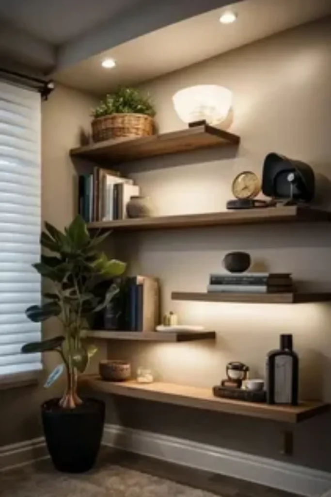 Corner shelves are perfect for utilizing overlooked spaces. These shelves fit neatly into corners, turning unused areas into functional storage zones. They’re ideal for displaying plants, photos, or small decorative pieces.
